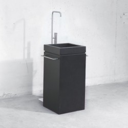Design Ablauf, Gehäuse mit Deckel und Hebergriff in Cns. Einlaufrohre in Cns (Kalt und Warmwasser) mit Rohrschellen befestigt. Ohne Überlauf, kann jedoch eingebaut werden.