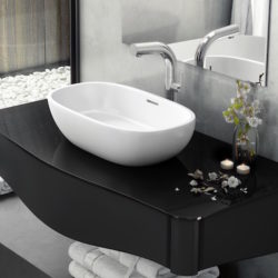 Ardesia Nera. Sichtflächen naturgespalten. Innenflächen fein geschliffen. Sichtkanten fein geschliffen und minimalst abgefast. Beckenboden mit ausgearbeiteten Gefälle zum Ablauf hin.